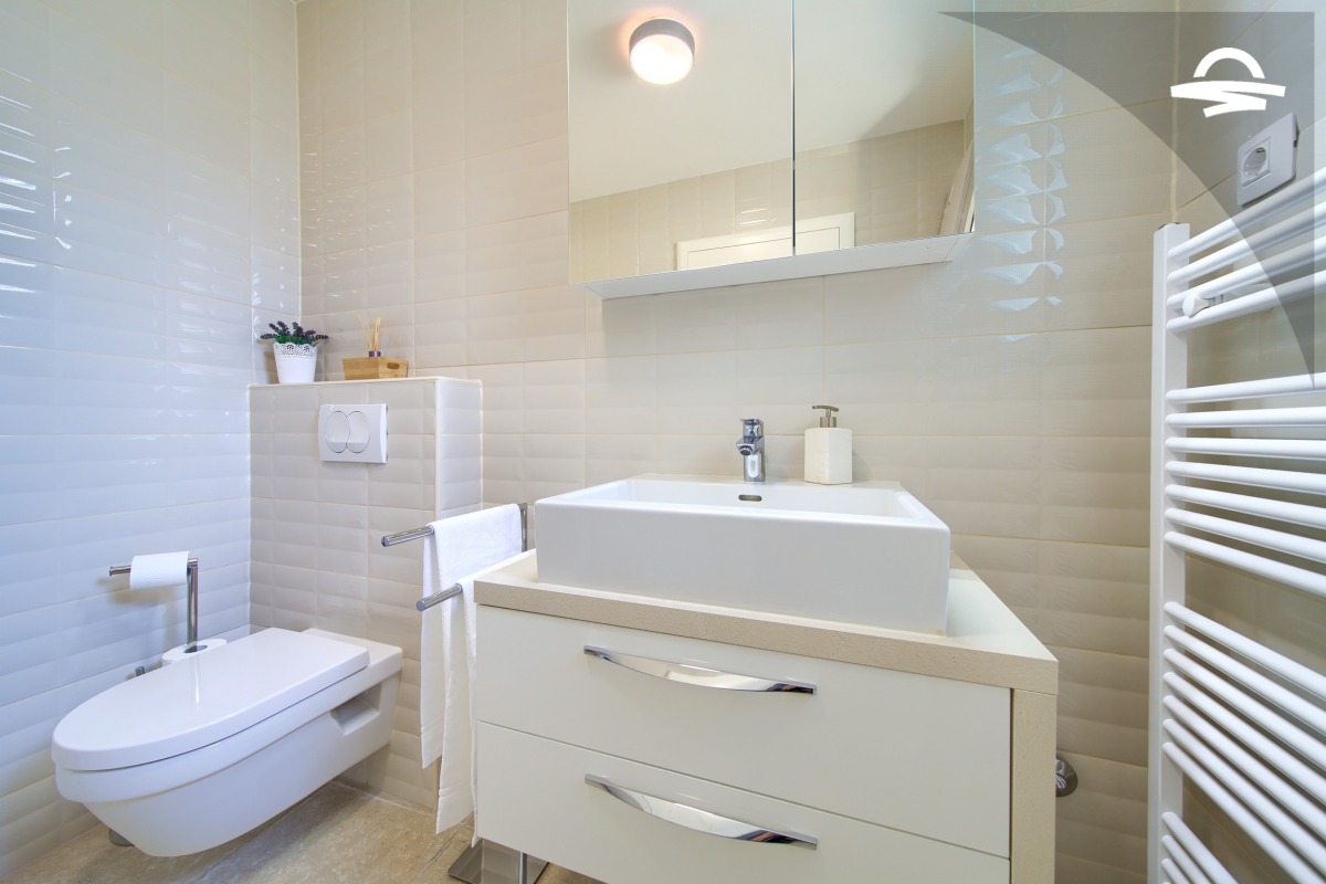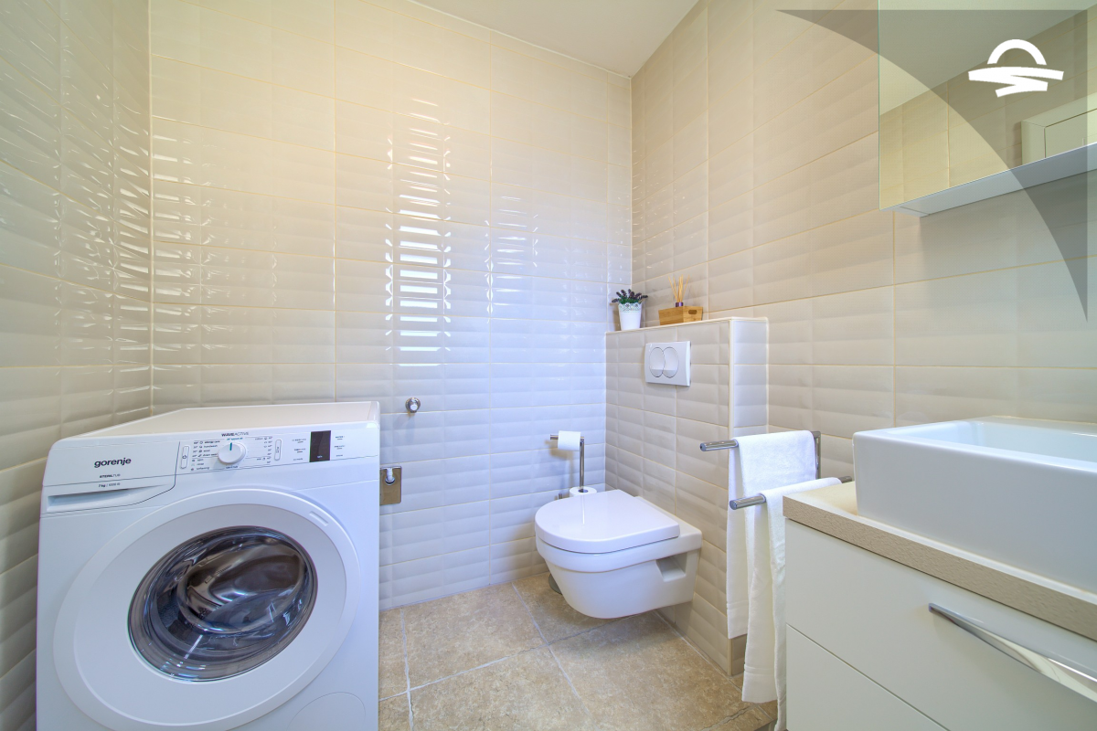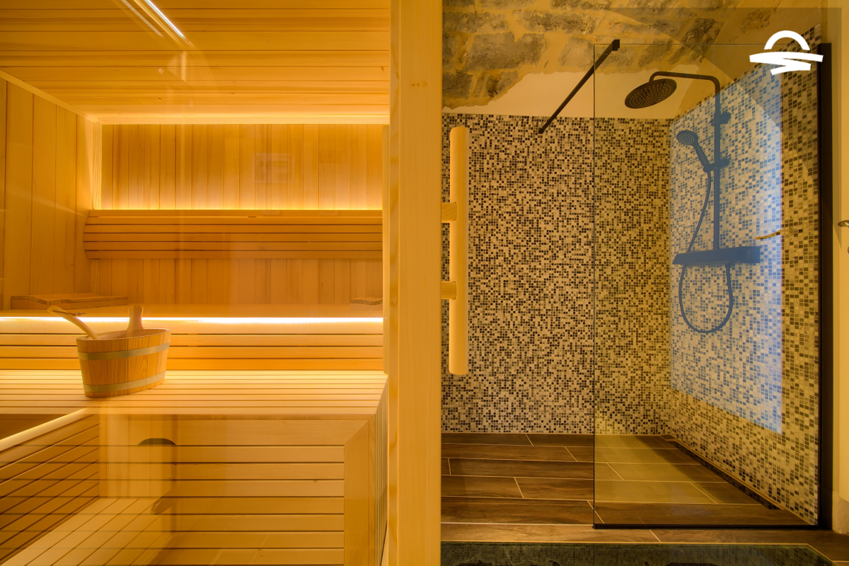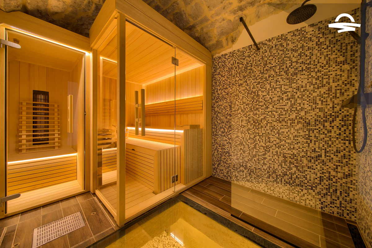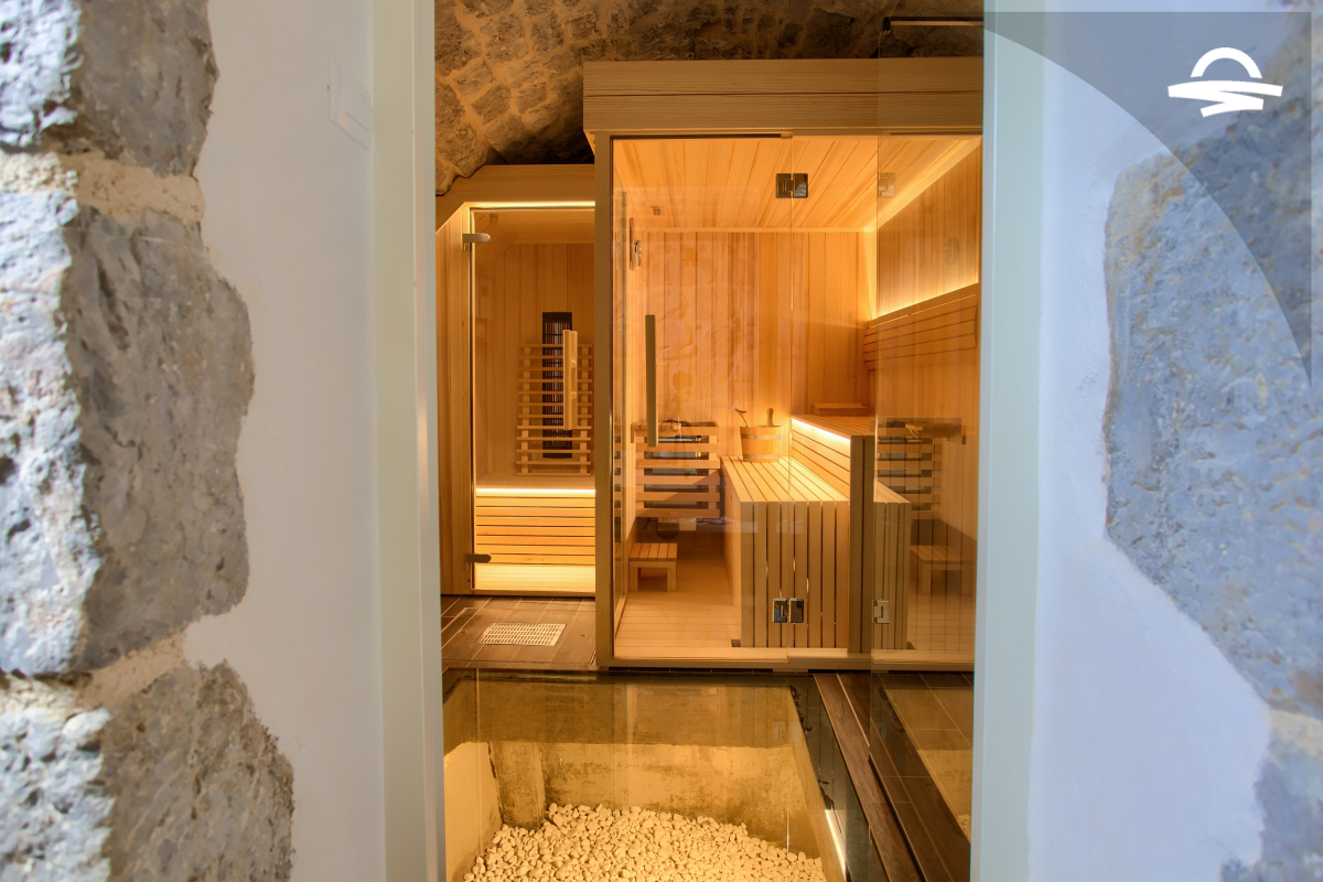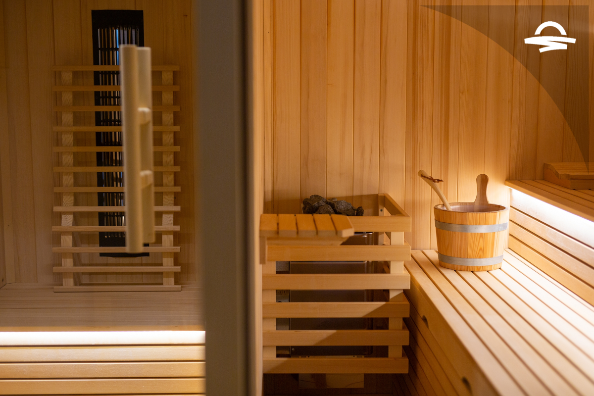 Im Erdgeschoss der Villa befinden sich ein geräumiges Wohnzimmer mit Esszimmer, Küche, eine Toilette und ein Wellnessbereich mit finnischer Sauna, Infrarotsauna und Dusche.