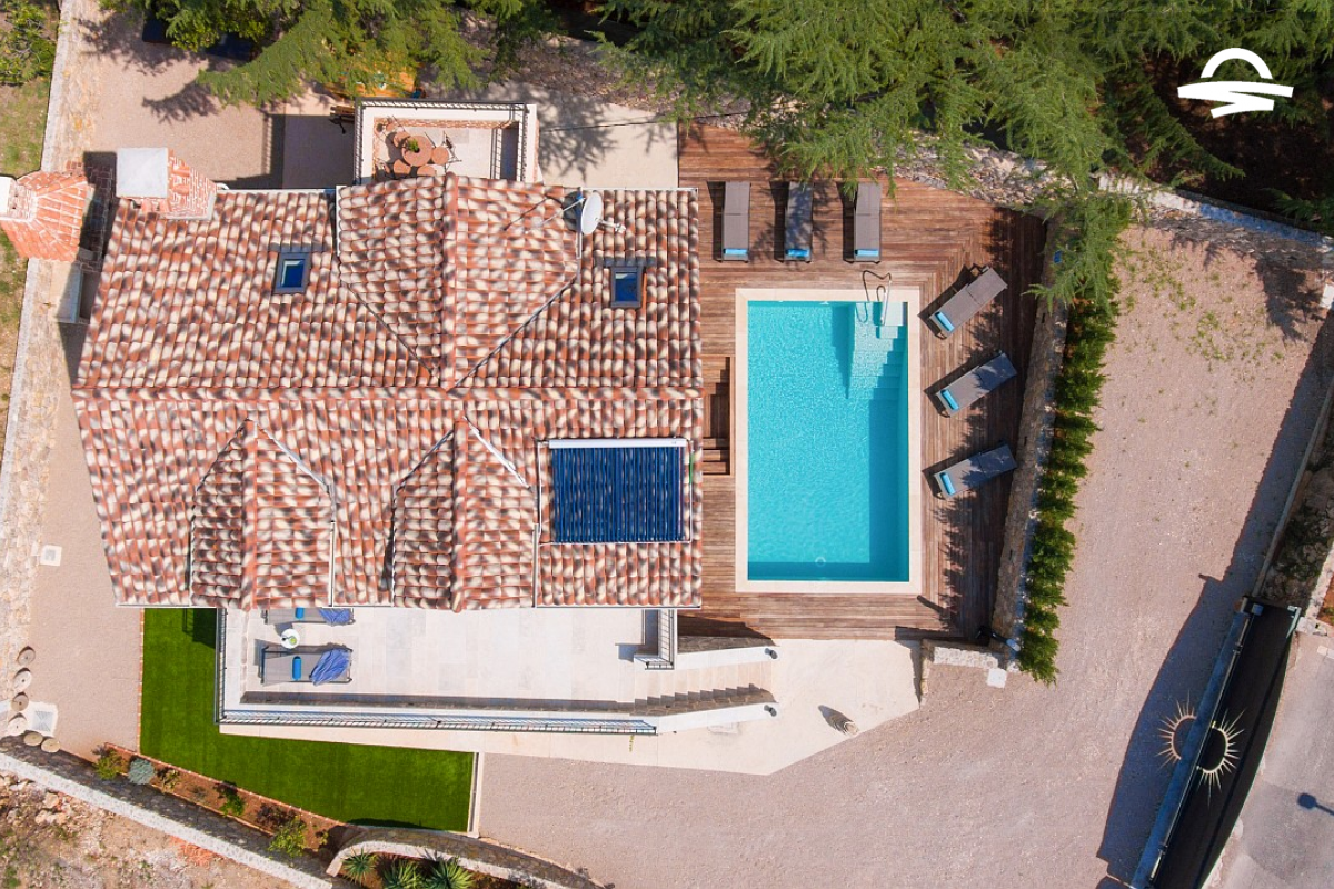 Villa Ive verfügt über wunderschön eingerichtete Zimmer für 8 Personen. Das Haus selbst befindet sich im malerischen, hügeligen Ort Vrh, nur 4 km von der Stadt Krk entfernt und bietet viel Ausstattung und Luxus. Im großzügigen Innenhof befindet sich ein beheizter Pool von 28 m2 mit Salzwasser, einer Gegenstromanlage und einer Sonnenterrasse mit Außendusche und 8 Liegen. Hinter dem Haus gibt es einen schönen Grill und einen massiven Holztisch, der von einer Pergola überdacht ist.