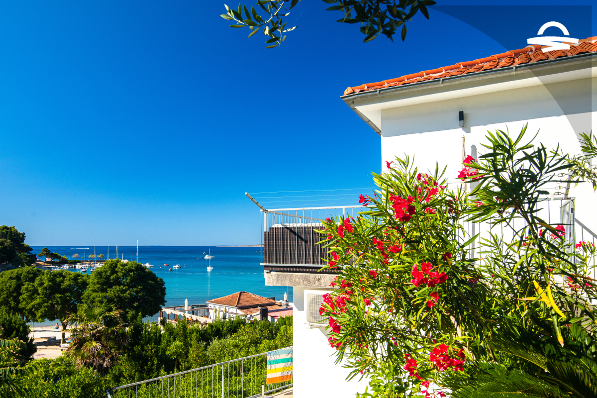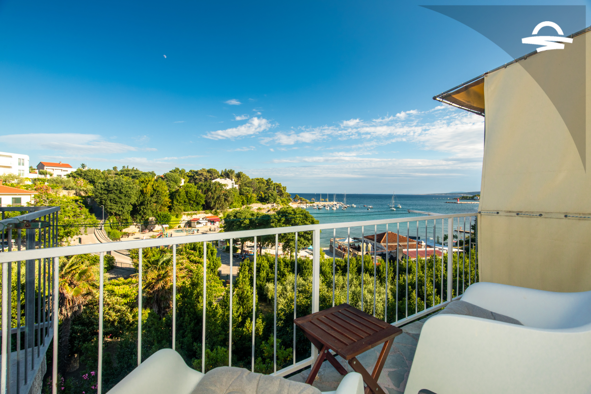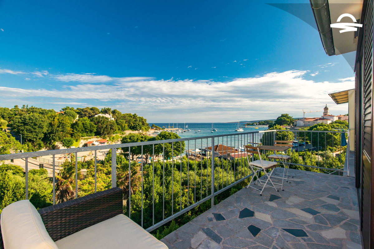 Genießen Sie einen herrlichen Blick auf die Altstadt der Stadt Krk und auf das Meer vom Balkon dieser Ferienunterkunft für 2 Personen im Stadtteil Portapisana.