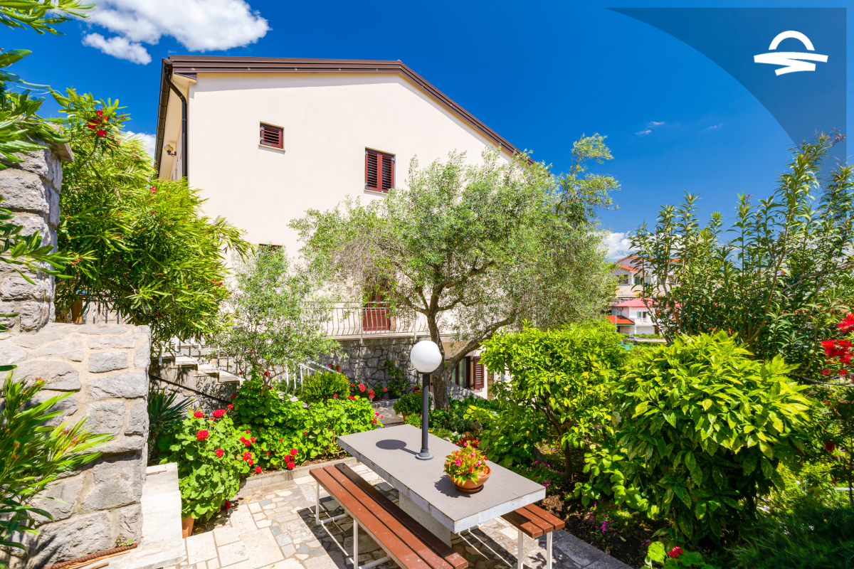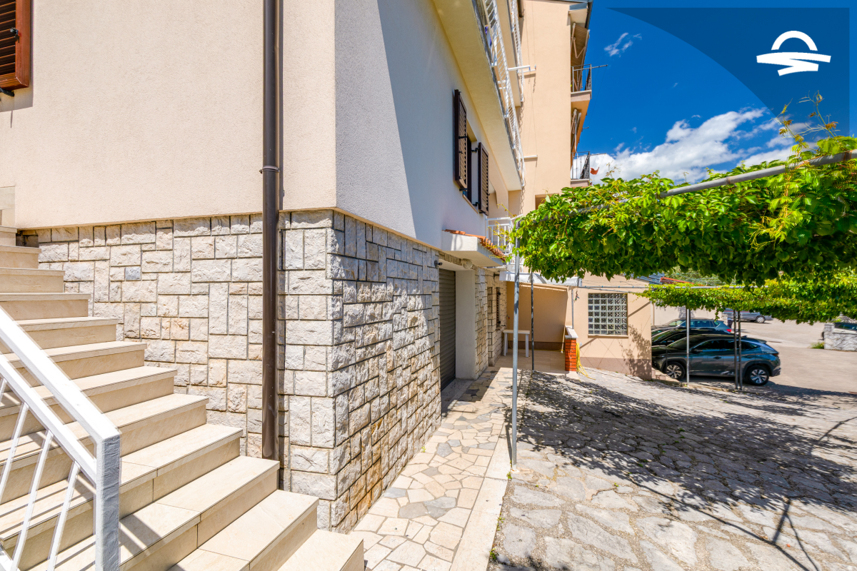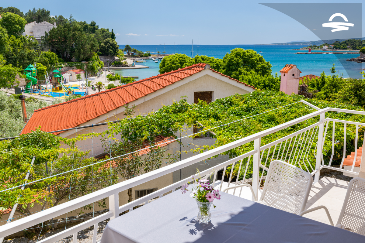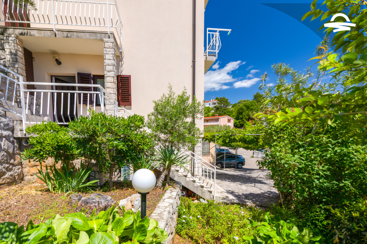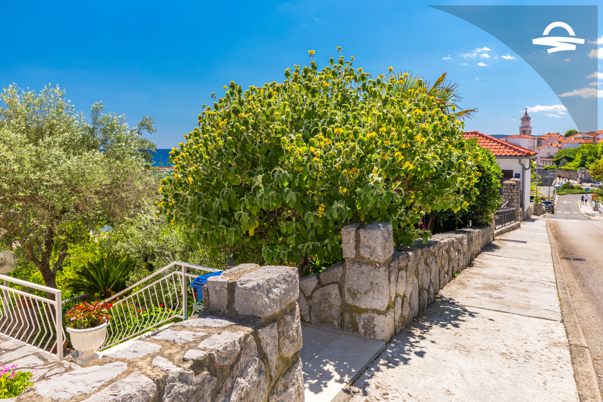 Im 1. Stock des Hauses stehen Ihnen auf 60 m2 Wohnraum zwei Schlafzimmer, ein Badezimmer mit Dusche und ein Wohnzimmer mit Küche zur Verfügung. Vom Wohnbereich gelangen Sie auf den großen möblierten Balkon der Unterkunft, von dem aus Sie eine herrliche Aussicht auf das Meer und die Altstadt von Krk haben.