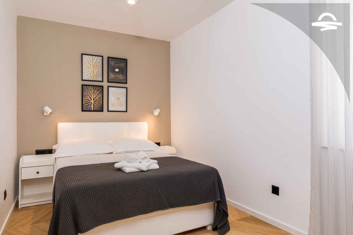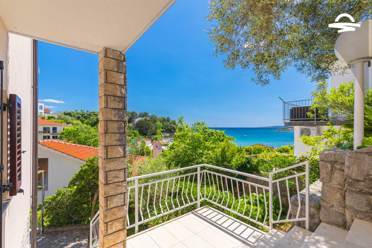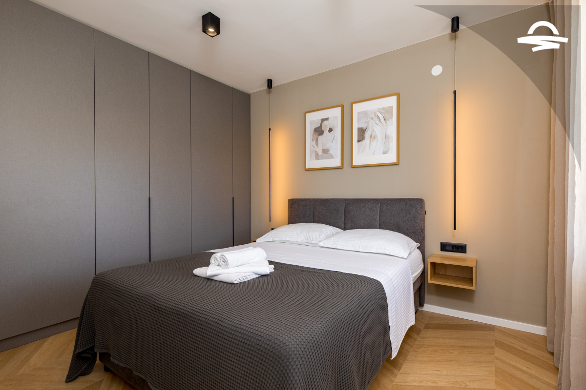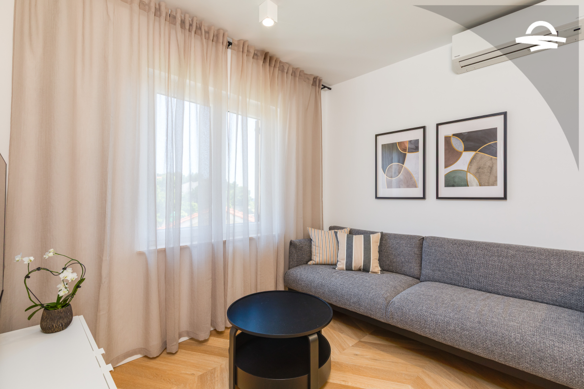 Im 1. Stock des Hauses stehen Ihnen auf 60 m2 Wohnraum zwei Schlafzimmer, ein Badezimmer mit Dusche und ein Wohnzimmer mit Küche zur Verfügung. Vom Wohnbereich gelangen Sie auf den großen möblierten Balkon der Unterkunft, von dem aus Sie eine herrliche Aussicht auf das Meer und die Altstadt von Krk haben.
