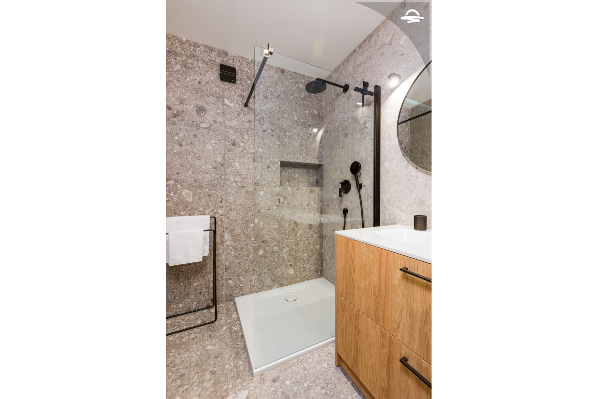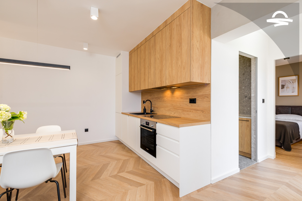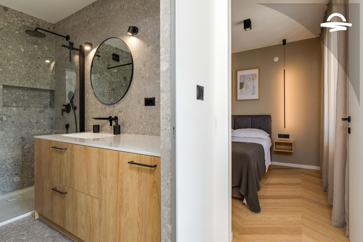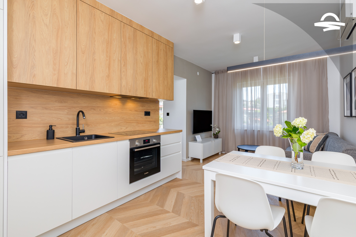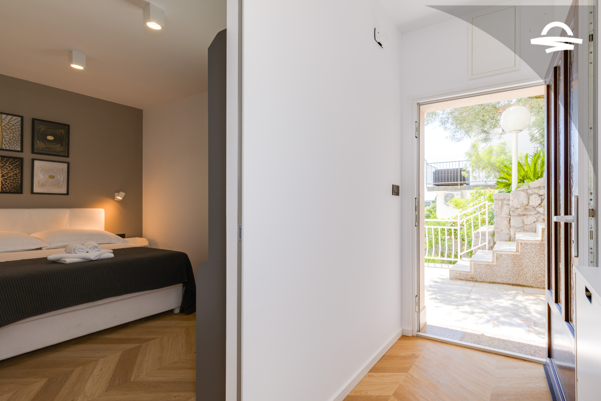 Im 1. Stock des Hauses stehen Ihnen auf 60 m2 Wohnraum zwei Schlafzimmer, ein Badezimmer mit Dusche und ein Wohnzimmer mit Küche zur Verfügung. Vom Wohnbereich gelangen Sie auf den großen möblierten Balkon der Unterkunft, von dem aus Sie eine herrliche Aussicht auf das Meer und die Altstadt von Krk haben.
