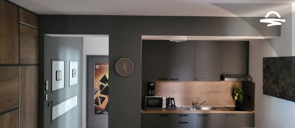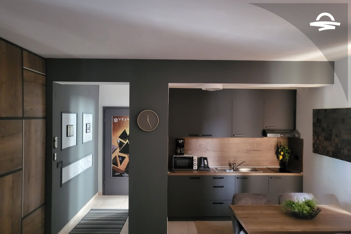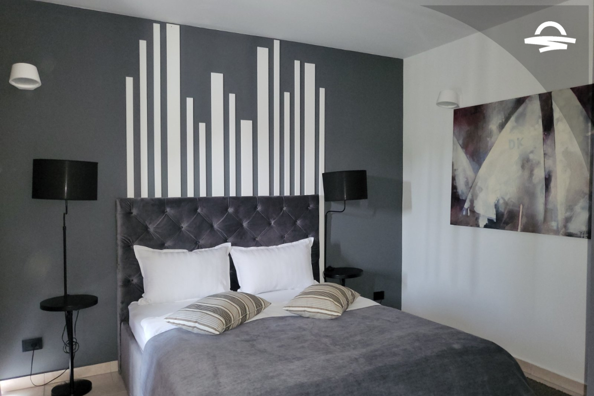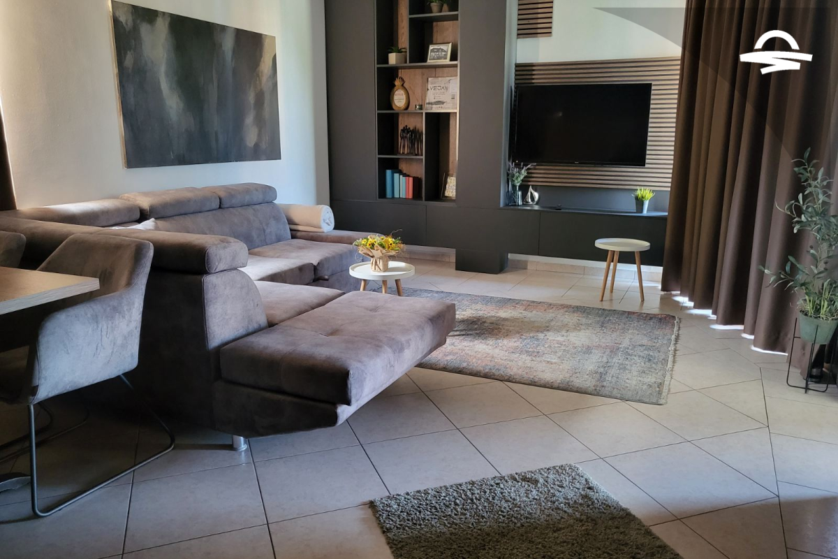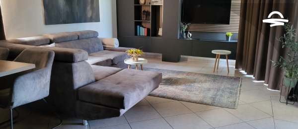 Moderne, geräumige Ferienwohnung mit Wohnzimmer, Schlafzimmer, Küche, Bad und Balkon.
