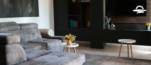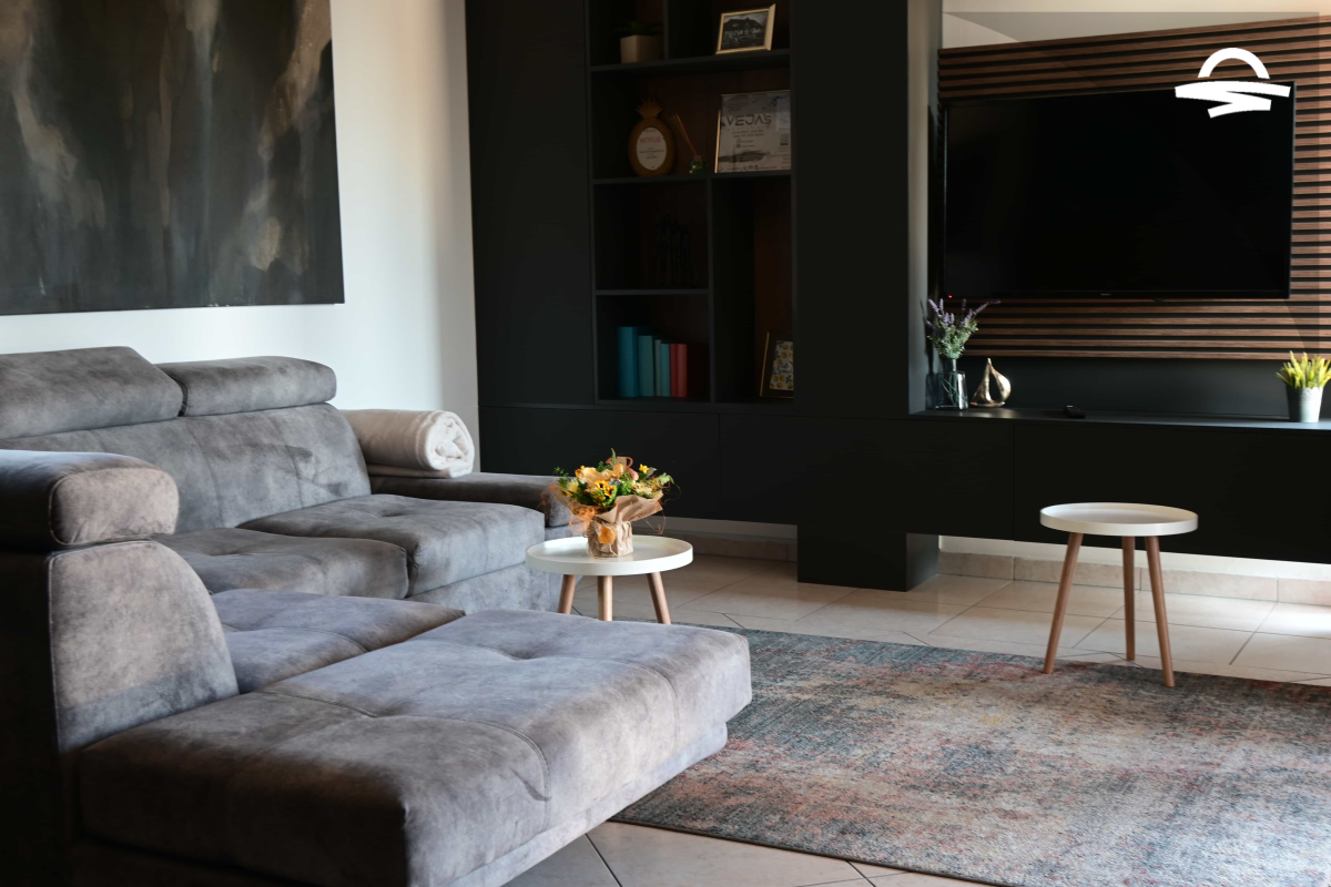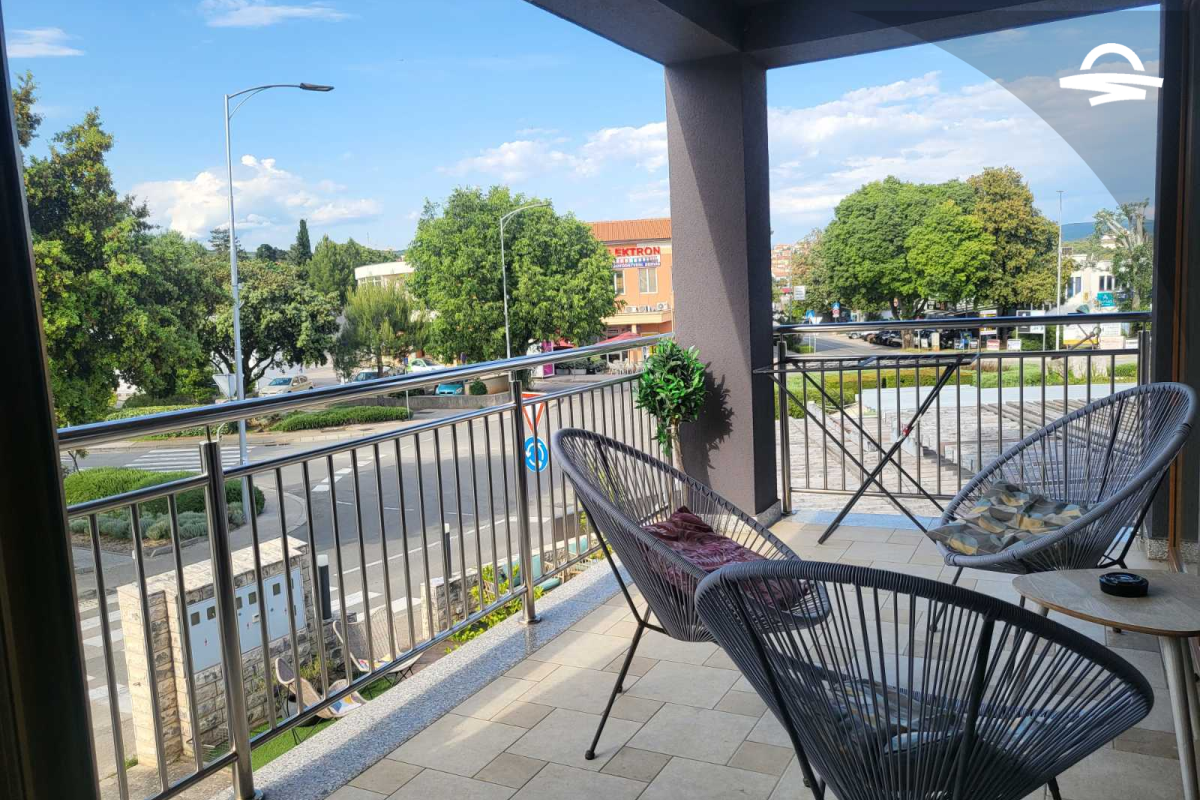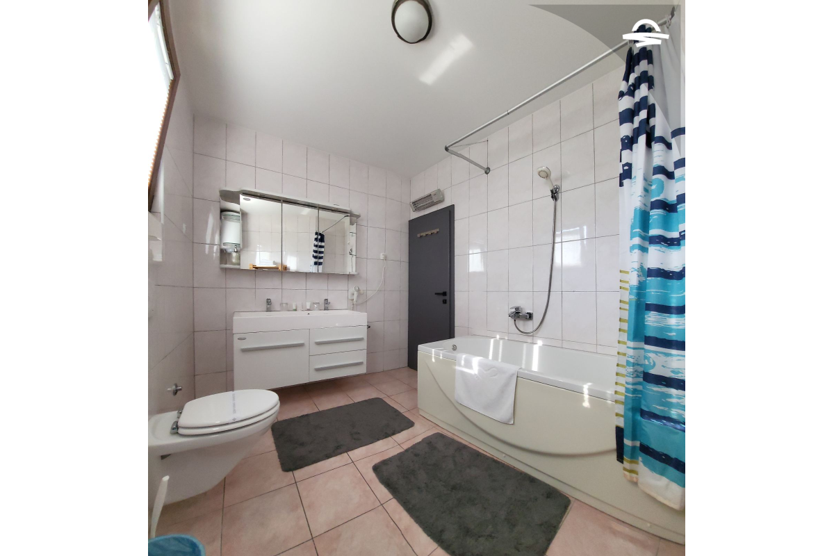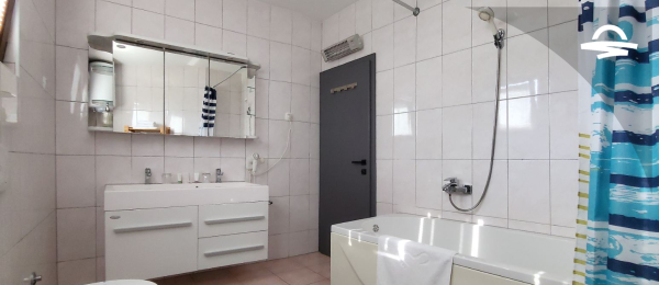 Moderne, geräumige Ferienwohnung mit Wohnzimmer, Schlafzimmer, Küche, Bad und Balkon.